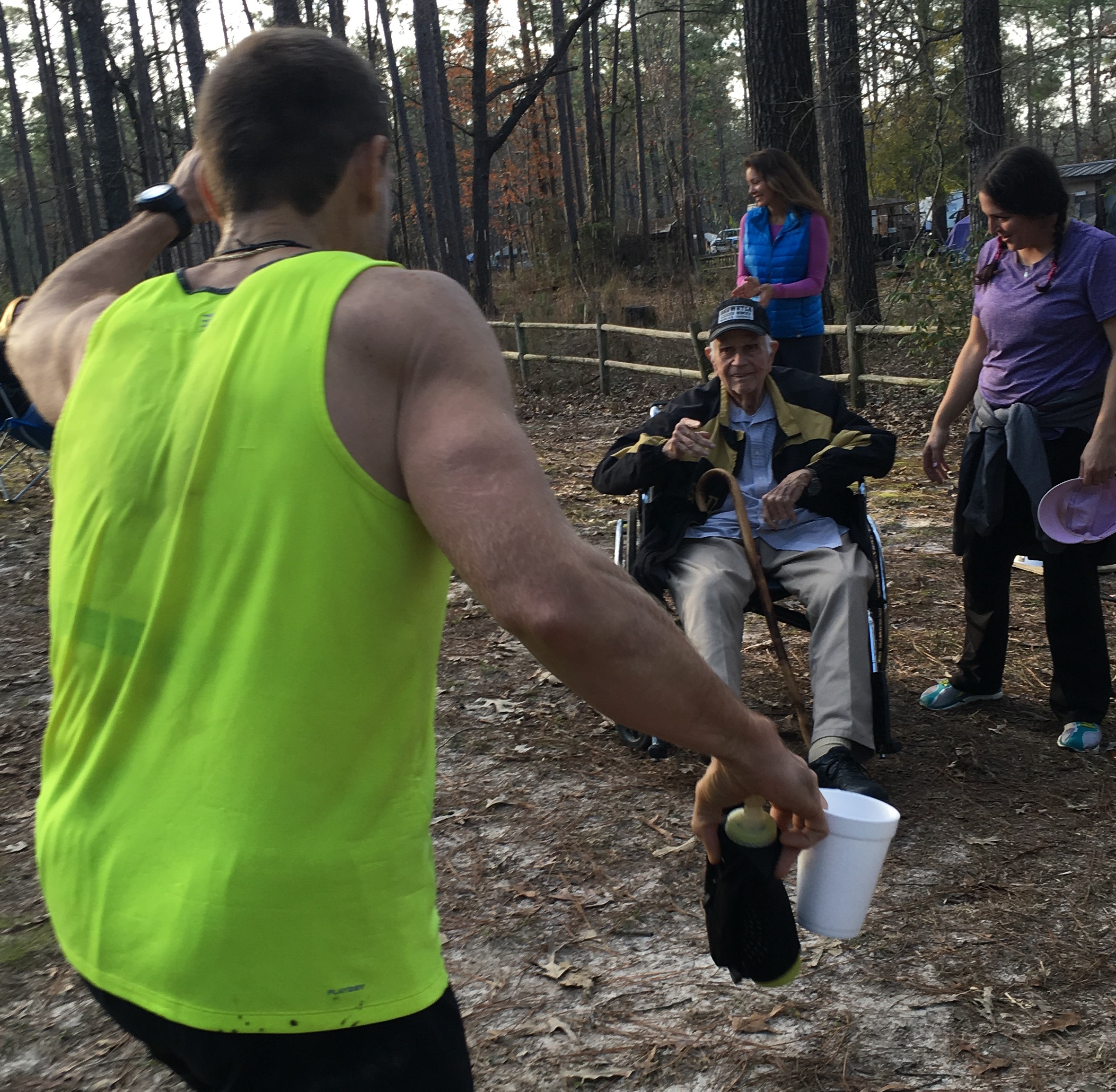 Then, out of nowhere, I heard footsteps. Uh oh! The 50k is over, this cant be a 50k’r. Can it? I looked back and saw a petite female blasting up the hill behind me. Then I noticed a yellow bib, that means she’s a 50 miler. Damn! I’ve done so well, I’ve come so far, I’ve never run stronger or longer in my life, regardless of gender, I don’t want to get passed now! So, I picked up the pace and kept looking back. I could see that I was getting some separation so I just kept pushing, and checking back to see if I was still pulling away. I was. Then, I saw a couple dudes standing there in the middle of the trail. As I approached, I could see one of them was wearing a yellow bib. I was about to pass a 50 miler! Cool! I mean, hell, I was happy to just still be running, much less passing folks. I ran up to the guy and high-fived him pretty hard, I was excited and was genuinely offering encouragement. Well, as I went to run past them, the guy not racing said, pointing at the racer, “He’s first place, so y’all are 1 and 2!” At first I thought he meant that I was now in first place, but after I thought about it for a minute, I decided that he meant that I was second and he was a lap ahead, in first. If I was in first there should be some indication when I got to the aid station. When I arrived, it was just business as usual; my brother met me at the woods, asked what I needed, yelled it to the rest of the crew, and they got it ready for me as I approached. It was confirmed in my head at that point: I was in second place. By this time, the girl that had been behind was even with me, and as we passed through the start/finish I heard them tell her she had 4 laps left, I had 3 left, so she was a lap down. I was relieved because she was fresh as a daisy, and I didn’t know if I could run with her for the rest of the race. Phew!